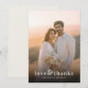 This wedding thank you card features a romantic and elegant design with two individuals standing close together against a warm, golden sunset background. The color palette is dominated by soft oranges, yellows, and beiges, creating a serene and affectionate mood. The layout centers on the figures, complemented by floral motifs in creamy white and gold tones, enhancing the timeless aesthetic. Delicate serif typography reads "love & thanks" at the bottom, paired with customizable names in a clean sans-serif font, making it perfect for expressing gratitude after a heartfelt celebration.