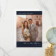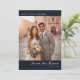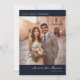 This wedding thank you card features a warm, romantic design with a photograph of a couple standing in front of an old stone building bathed in golden sunlight. The layout is balanced and centred, with ample space for text on the right side, using a navy blue background that contrasts beautifully with the soft, inviting tones of the photo. Elegant typography includes a modern sans-serif font at the top and a flowing cursive script below, adding a personal touch to this heartfelt keepsake. Perfect for expressing gratitude after your special day, this card captures the joy and warmth of your celebration.
