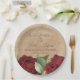 This romantic and rustic wedding plate features a beautiful floral theme. The background is a vintage parchment paper pattern with watercolor red roses bordering the lower portion.