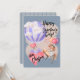 This custom Valentine's Day greeting card magnet features a cute, romantic fox watercolor theme. Two whimsical love foxes are pictured kissing in the bottom right. A cute little mouse is floating away in a hot air balloon. A custom name is printed over a pink heart in the bottom left over a dusty blue background.