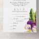 This romantic floral wedding invitation features an all-in-one design with an R.S.V.P. card included at the bottom. The background is a simple and elegant white with purple watercolor violets. A delicate bouquet of violet flowers is picture on the front flap, and two on the inside portion.