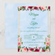 Set the tone for your unforgettable celebration with this romantic watercolor wedding invitation. A calming sky blue background creates a dreamy canvas for red, blush, and white florals. Lush greenery beautifully framed by a soft, champagne beige border. Paired with modern sage-grey typography, this design blends timeless elegance with a fresh, natural feel. Perfect for a garden ceremony, outdoor celebration, rustic chic, or boho-inspired wedding.
