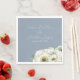 These romantic floral napkins feature an elegant dusty blue background with watercolor ranunculus flowers. A delicate bouquet of ranunculus and greenery is pictured on the bottom. Sample names of a newlywed couple and wedding date are printed above. You can personalise the napkins to include your own custom names or text.