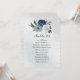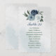 Beautiful botanical seating chart card featuring romantic white, dusty blue and navy blue flowers with green leaves.