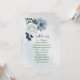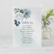 Beautiful botanical seating chart card featuring romantic white, dusty blue and navy blue flowers with green leaves.