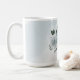 Beautiful botanical coffee mug featuring romantic white, dusty blue and navy blue flowers with green leaves.