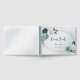 Beautiful botanical wedding guest book featuring romantic white, dusty blue and navy blue flowers with green leaves.