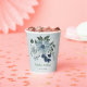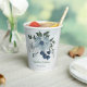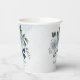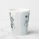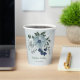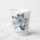Beautiful botanical paper cup featuring romantic white, dusty blue and navy blue flowers with green leaves.