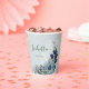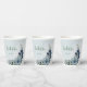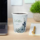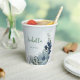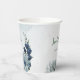 Beautiful botanical paper cup featuring romantic white, dusty blue and navy blue flowers with green leaves.
