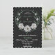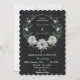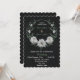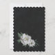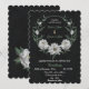 Unique wedding invitation featuring romantic white flowers and green leaves on black background.