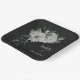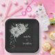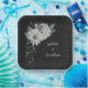 Unique wedding paper plate featuring romantic white flowers and green leaves on black background.