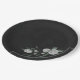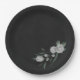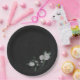 Unique wedding paper plate featuring romantic white flowers and green leaves on black background.