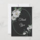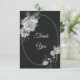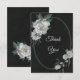Unique wedding thank you card featuring romantic white flowers and green leaves on black background.