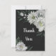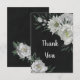Unique wedding thank you card featuring romantic white flowers and green leaves on black background.