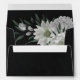 Unique wedding envelopes featuring romantic white flowers and green leaves on black background.