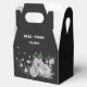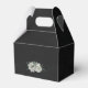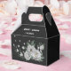 Unique wedding favour box featuring romantic white flowers and green leaves on black background.