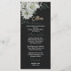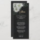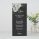 Unique wedding menu card featuring romantic white flowers and green leaves on black background.