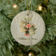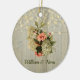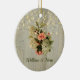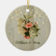 This keepsake ornament has a simple rustic look. The background is whitewashed, weathered barn wood.