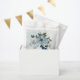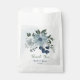 Beautiful botanical wedding favour bag featuring romantic white, dusty blue and navy blue flowers with green leaves.