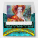 Original contemporary watercolor painting with golden foil and iridescent colours in bright green,yellow orange , teal,turquase, white .Elegant ,beautiful sophisticated brunette woman,red,green sparkling gold fabrics of a baroque costume with peacock feathers .Painting by Bulgan Lumini (c).This cool and artistic card is perfect for weddings,bridal showers,sweet 16,quinceanera birthday parties,costumed dance balls,,romantic engagements,save the date announcements,cocktails,celebrations,anniversaries,gatherings,