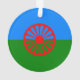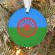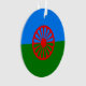 Official Romany gypsy traveller flag of green and blue representing the earth and sky with a red wagon wheel, representing travel.