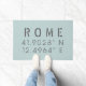 Stylish front doormat features Rome, Italy latitude and longitude map coordinates in modern urban text on light blue background