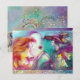 Balcony scene from Romeo and Juilet tragedy by William Shakespeare .Original contemporary watercolor painting with golden foil and iridescent colours in bright purple ,pink,green,yellow orange , teal,turquase, white ..Painting by Bulgan Lumini (c)