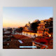 Rooftops of old buildings in Mexico at sunset. The dying light brings out the gorgeous reds of the buildings. The ocean can just barely be seen in the distant background.