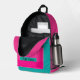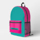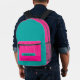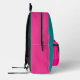 A bright hot pink and teal backpack includes a zipped front pocket in candy stripes . Perfect for school ,gym ,overnight travel and more.Lightweight and durable with room for laptops and water bottles.