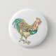 Button pin featuring a colourful, vintage-inspired rooster illustration. Artwork copyright: Dominic A. White. All rights reserved.