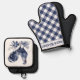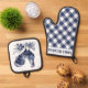 "Rooster" Blue Willow Style Custom Oven Mitt & Pot Holder Set. Introducing our beautiful kitchen oven mitt and pot holder set, featuring a charming blue rooster with flowers on a white background on the pot holder and a gingham pattern on the oven mitt. Inspired by the Willow Blue China Style colour palette and style, this piece adds a touch of charm and elegance to any kitchen decor. What sets this product apart is its customisation option, allowing you to personalise it with your name or the name of a loved one, making it a thoughtful gift. To complete your kitchen ensemble, we offer coordinating products such as a cutting board, kitchen towel, as well as a wall clock and coffee/tea mug. The best part? The wall art, coffee/tea mug, cutting board, and oven mitt can all be customised to your liking.