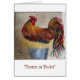 Original on large slate tile. Blilliant feathers gracefully drape over bucket rooster is sitting on, on bed of straw.