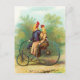 Funny vintage illustration of roosters in vintage dress riding a two seated bicycle and looking lovingly into each others eyes