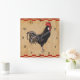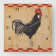 An rooster against a vintage tan background, surrounded by a red chequered border