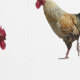 Photo of rooster (cockerel) with red comb, yellow / brown body, black tail feathers and pink legs. This picture can be easily customised with your own text on many different products.