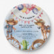 Cowboy Rootin' Tootin' Good Time Birthday Paper Plates. Celebrate your little one's milestone 2nd birthday with our Cowboy Rootin Tootin' Good Time paper plate. This fun and festive design captures the spirit of the Wild West with a playful cowboy, his trustry horse, a classic wagan wheel, and a rugged cactus. The paper plate is topped with colourful balloons and flags, adding a touch of party cheer. A rope detail ties it all together, making this the perfect invite for a Western-themed celebration. Personalise it with all your party details to make your child's special day unforgettable.