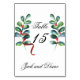 Rose and Berry Watercolor Stems Wedding Table Numbers. These designs include watercolor roses with interesting foliage and rich red berries. The colours in this suite include creamy-peachy roses, red roses and berries and are accented with teal and green foliage.