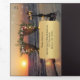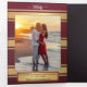 Tri-fold seaside wedding invitation featuring two of your own favorite photos. This design shows a rose arbor on the beach at sunset, with festive string lights. A stylish touch is added by the gold print. Beautiful for a nautical, beach or destination wedding.