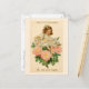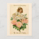 This vintage Valentine features a young girl sitting on top of a pretty bouquet of pink roses. Original text on the card says “Valentine Greetings To the One I Love”.