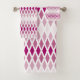 Diamond sizes - bath towel matches shower curtain, washcloth matches toothbrush/soap dispenser set.