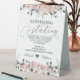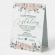 A Lovely Wedding Sanitising Station Sign featuring soft dusty rose pink florals and eucalyptus green leaves and a swirly delicate typography script "Station". You can change the names and text from the Personalise Menu, or customise it further with the tools provided. If you need help and for other matching products, please contact me.