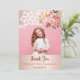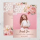 An elegant First Communion Thank You photo card. A rose gold gradient background decorated with pink roses, flowers and lace. Personalise and add a photo on the front and thank you note on the back.