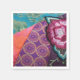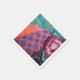An array of embroidered, tapestry look fabrics in a bohemian print. Garnished with an embroidered rose. In colours of purple, gold, pink, turquoise and orange.