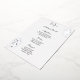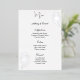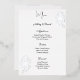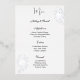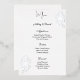 This wedding menu card is shown in an elegant white and silver foil rose print, script and standard text in a black colour.