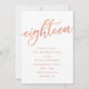Rose Gold 18th Birthday Party Invitations: Pretty rose gold 18th birthday party invitation design featuring bright rose gold foil look "eighteen" written in hand-lettering script typography. Contemporary lettering fills out the party details. [Note that while elements of this design will print to look like foil, no actual foil or metallic ink is used in creating the invitations - the rose gold foil is a printed effect.]