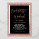 These glam, stylish bachelorette party invitations feature a faux rose gold glitter look (please note this is not actual glitter, but an image of glitter) and actual rose gold foil centre frame, with modern matching rose gold foil handwritten script. The very centre of the invitation is black. There is room to add your itinerary on the back.