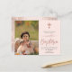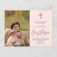 Modern Girl Baptism thank you postcard featuring single photo of the baby, blush pink background , rose gold cross and typography script ''Baptism'' in rose gold handwritten lettering. Perfect for thanking your family and friends for celebrating your daughter's Baptism with you. Personalize with a name , photo and family name.