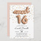 Unique sweet sixteen birthday party invitations feature "sweet 16" spelled out in rose gold balloons, on a background of rose gold, gold and black confetti. Personalize with your party details in modern black lettering. Invitations reverse to solid blush pink.