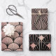 Stylish trio of wrapping paper sheets features three different rose gold and black Art Deco geometric designs.