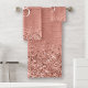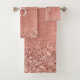 Easily personalise this trendy chic bath towel set design featuring pretty rose gold sparkling glitter on a rose gold brushed metallic background.
